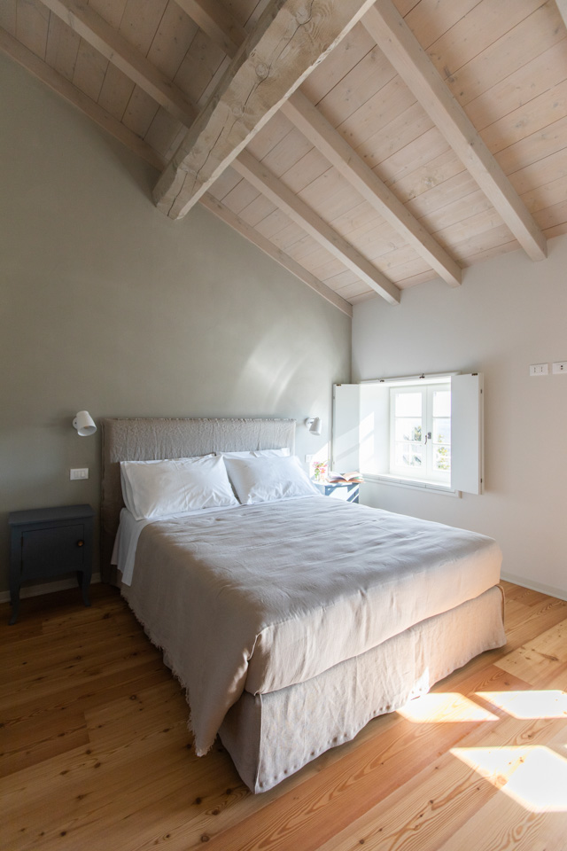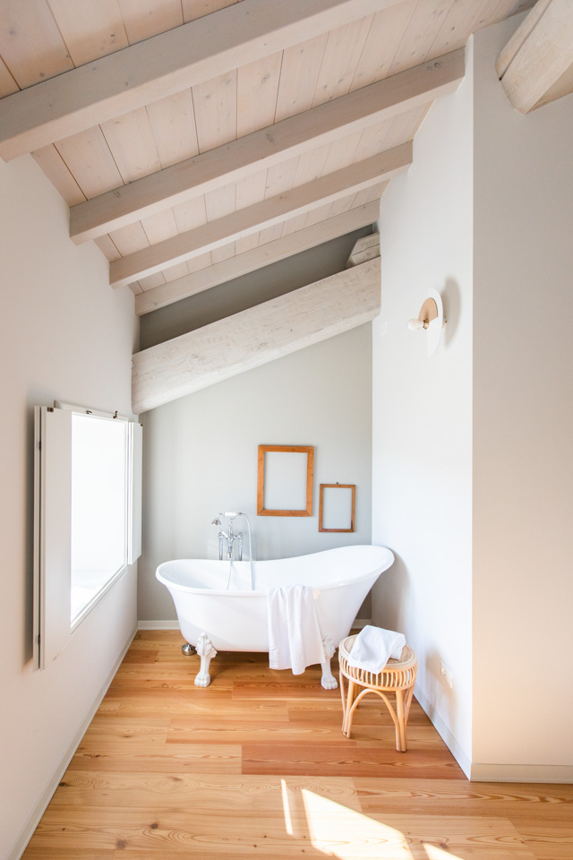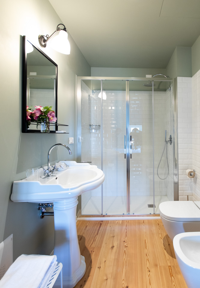 Al piano primo, ariose e ricche di dettagli scelti con cura. Una di queste, oltre allo spazio doccia, presenta una vasca da bagno.
